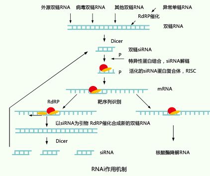 RNAi 是 真核生物 中一種普遍存在且非常保守的機制 , 是一個天然的抗病毒機制。 RNAi 的作用機制可簡述為“雙鏈 RNA 降解 mRNA 從而阻斷特定蛋白質的合成”,具體過程如下圖: