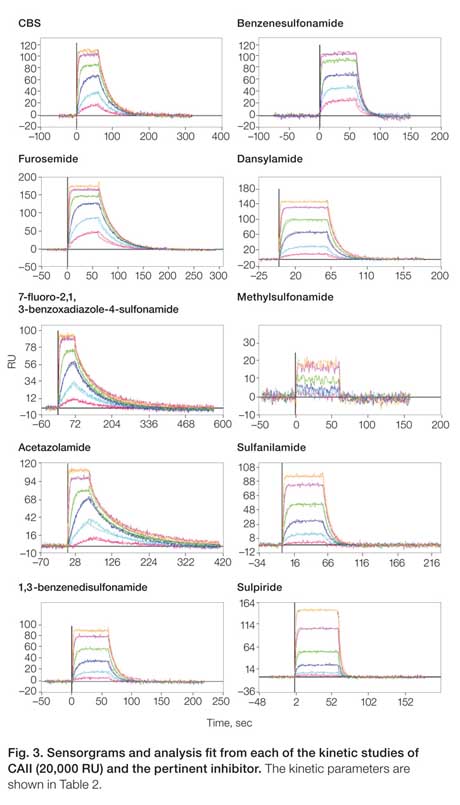 首先將CAII蛋白標記在GLH芯片上。采用氨基偶聯,將CAII蛋白用pH 5.0的NaAc溶解,標記在芯片上,可達21,200 RU。待基線穩定后再上小分子抑制劑溶液。待反應全部結束后,用ProteOn Manager軟件分析結果。這些小分子抑制劑的名稱、分子量、反應最高濃度和結果等信息見下表,反應曲線見下圖: