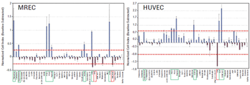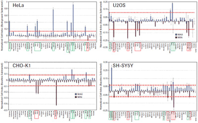 將檢測結(jié)果數(shù)據(jù)導(dǎo)出至Microsoft Excel,進(jìn)行后續(xù)計算。確定每孔細(xì)胞的最大與最小細(xì)胞指數(shù)值,計算重復(fù)檢測(n=2)的均值標(biāo)準(zhǔn)差與平均值。對于對照孔細(xì)胞來說,對重復(fù)檢測 8 個孔的均值標(biāo)準(zhǔn)差進(jìn)行測定。將這些數(shù)值平均并乘以 3 以計算“hit”閾值。對于 Z 因子與 EC50 計算來說,使用RTCA MP提供的動態(tài)反應(yīng)曲線,選擇一時間點(diǎn)作為細(xì)胞系及藥物綜合反應(yīng)的最佳時間點(diǎn)。