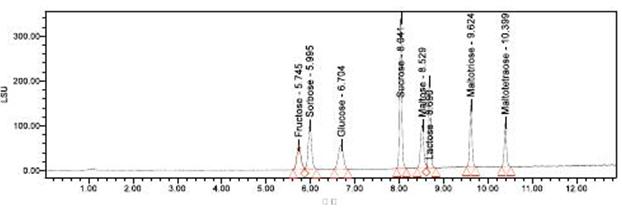 其中較難分離的 Fructose( 果糖 ) 和 So rbose( 山梨糖 ) 、 Maltose( 麥芽糖 ) 和 Lacto se( 乳糖 ) 均分別達(dá)到 1.6 、 1.5 的分離度。