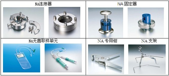NA 無菌取樣系統包括:NA無菌取樣單元、NA連接器、NA固定器、支架和輔助用專用鉗。其常用部件如圖一所示。