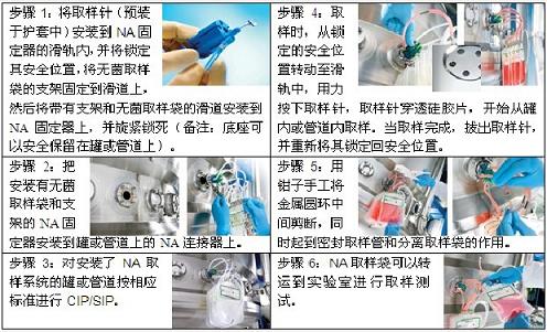 無菌取樣袋的取樣針是密封在頂針導管內,并與取樣袋連通,頂針導管前端為一硅膠片,出廠時經Υ射線滅菌處理,此設計同時能使取樣針保持無菌狀態。使用時,通過NA固定器和連接器將其固定在罐子或管道上,僅頂針導管前端的硅膠片能與制品接觸,在對罐子或管道進行CIP、SIP的同時,硅膠片的表面同樣進行了清洗和滅菌。產品除菌過濾到罐子內需要取樣時,將取樣針的扳機從安全位置取出,用力按下取樣針的扳機,取樣針穿透硅膠片,開始從罐或管道內取樣。當取樣完成后,拔出取樣針,硅膠片因彈力作用,自行恢復形狀進行密封。再用專用鉗將金屬圓環壓扁并從中間剪斷,對罐子進行第二道密封和分離無菌取樣袋入口管。