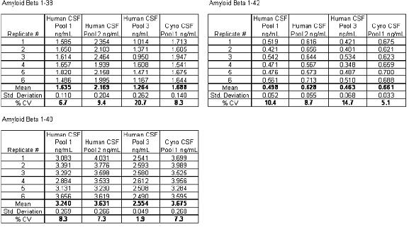 用3種人腦脊液混合樣品和1種猴腦脊液混合樣品配制了0.2、0.8、2和6ng/mL的過量加標的質控樣品。準確度和精確度數值符合LC/MS/MS測定的控制標準。質控樣品分析的典型結果如表3所示。