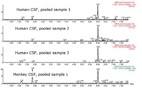 圖6:顯示3種人腦脊液和1種猴腦脊液中β淀粉樣1-42肽基線水平的典型色譜圖