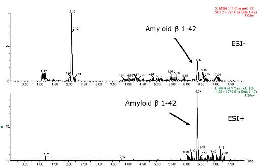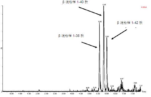 β淀粉樣肽(Aβ)的不溶性聚集物在腦中沉積/形成被看作為早老性癡呆病(AD)的一個關鍵事件。治療策略集中于用以減少β淀粉樣肽生成或提高其清除水平的小分子抑制劑或免疫療法。因此,找到能對腦脊液中的淀粉樣肽進行高靈敏且穩定可靠的定量分析方法以確定其與AD關系對很多研究者來說至關重要。然而,對這些Aβ肽的分析極具挑戰性,這不僅因為其在生物液體內的豐度相對偏低,而且也因為它們可能被其它蛋白質結合并具有形成低聚體的趨勢。