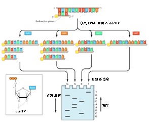 雙脫氧鏈終止法又稱(chēng)為Sanger法,其原理是DNA模板在DNA聚合酶、引物、四種脫氧核苷酸三磷酸(dNTP)存在下進(jìn)行復(fù)制時(shí),在四管反應(yīng)體系中分別按一定的比例引入四種雙脫氧核苷三磷酸(ddNTP)。由于ddNTP缺乏延伸所需要的3’-OH基團(tuán),當(dāng)ddNTP摻入鏈的末端時(shí),該鏈就會(huì)停止延伸。如此每管反應(yīng)體系中就產(chǎn)生了一系列長(zhǎng)度不等的以ddNTP為3’端的DNA片段。反應(yīng)終止后,分4個(gè)泳道進(jìn)行凝膠電泳以分離長(zhǎng)短不一的DNA片段,相鄰的片段長(zhǎng)度相差一個(gè)堿基。經(jīng)放射自顯影后,根據(jù)片段3’端的雙脫氧核苷,便可獲得合成片段的堿基排列順序。