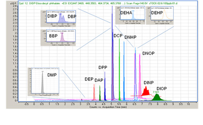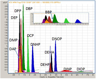 安捷倫利用超高靈敏的分析工具-快速液相串聯質譜儀進行微量分析。快速液相色譜串聯質譜儀可以減少系統背景干擾與溶劑使用量,同時搭配簡單萃取與稀釋的樣品前處理方法,可以同時分析13種鄰苯二甲酸酯類:DMP、DEP、DAP、DPP、DBP、BBP、DCP (Dicyclohexyl phthalate) 、DNHP、DEHP、DEHA、DNOP、DINP和DIDP。本方法快捷、準確,是解決大批量樣品高通量分析的最佳方法。
