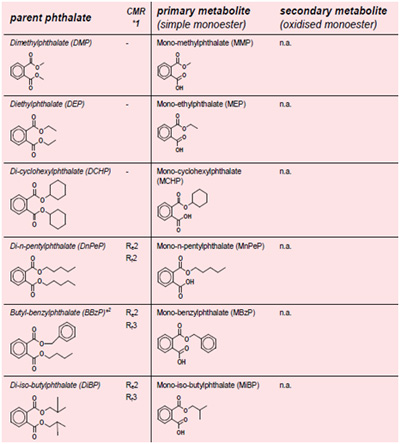 表2. 6種法規控制的增塑劑成分及其可能的體內代謝物。