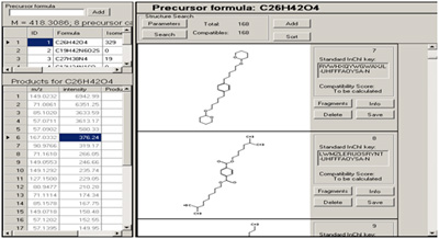 通過MS/MS與PCDL 數據庫中標準圖譜的比對,可以對復雜食品基質中的增塑劑成分進行快速和準確的定性篩查(圖7);運用MSC軟件自動對二級質譜中的碎片離子進行結構解析及其相互關系的剖析(圖8)。