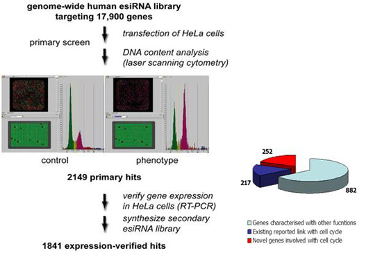 為了鑒定Hela細(xì)胞中的參與細(xì)胞周期調(diào)控的基因,Kittler等在Acumen eX3平臺上開發(fā)出一種快速可靠的高通量分析方法,檢測基因組DNA的含量,作為細(xì)胞周期表型改變的初步檢測(圖1)。他們使用由內(nèi)切核酸酶制備的小干擾RNA(簡稱為esiRNA),集合了數(shù)百個針對單基因的靶點,這避免反復(fù)篩選過程,能迅速實現(xiàn)基因沉默,確保脫靶效應(yīng)最低。整個實驗在384孔板上進(jìn)行,用17,828個基因的esiRNA庫來轉(zhuǎn)染的細(xì)胞,72小時之后固定細(xì)胞,并用碘化丙啶(Propidium Iodide)染色,隨后用Acumen eX3高內(nèi)涵細(xì)胞分析儀進(jìn)行掃描和分析。Acumen eX3的軟件能夠迅速定量細(xì)胞數(shù)目和subG1、G1、S、G2/M期、4N-8N和8N細(xì)胞的比率。
