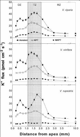 上圖:不同品種的葡萄根部在不同處理(正常含氧量, HPT,NHPT)下不同區域的K+流速圖譜。