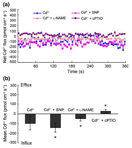 NO是一種重要的生物活性氣體和功能分子。在植物遭受生物和非生物脅迫下,包括重金屬Cd2+時NO作為信號分子起作用。Cd2+是一種非必需和有毒的重金屬,能夠引起植物的細胞程序性死亡(PCD)。 中國科學家使用非損傷微測技術等方法研究了煙草BY-2細胞暴露在150µM的CdCl2中出現PCD的調節因素。發現Cd2+誘導PCD出現時伴隨著NO含量的顯著增加。施加NO釋放劑SNP可以加速PCD,也可以促進Cd2+的內流,導致胞內Cd2+的更多積累。NO合成酶抑制劑L-NAME和NO特異清除劑cPTIO緩解了Cd2+引起的毒性,降低了Cd2+進入細胞的速率,減少了胞內Cd2+的累積,甚至是導致Cd2+外流。基于這些發現,認為NO通過調節Cd2+的吸收和促進Cd2+在BY-2細胞的積累導致Cd2+誘導的PCD中扮演著正調控的作用。 本研究使用非損傷微測技術直接測定了Cd2+的進出,第一時間獲得了NO對Cd2+運輸調節的證據,對于認識植物吸收Cd2+的調節機理非常重要,同時還可以根據這項研究尋找富集Cd2+的植物,為植物修復提供幫助。
