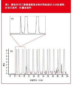 其次,我們優化了制備型進樣的ELSD設置,結果如圖2所示。從分析型到制備型設置出現了兩個改變:流速從4 mL/分鐘提高到10 mL/分鐘,改性劑百分比從15%增加20%;這兩種改變將導致流入ELSD的液體增多。在我們的前一項研究3中,對氣體流速和蒸發溫度的作用進行了描述。簡言之,氣體流速越高,停留時間就越短,出現散射的次數也越少,進而信號越差。氣體流速越高,噴霧過程中所形成的小顆粒就越多。粒徑的減小也導致散射光的強度降低。此外,也建議將蒸發溫度維持在盡可能低的水平下,以保持粒徑的一致性,并通過增強溶解結晶作用而獲得更好的信號。這一點與圖2所示的結果吻合:增加氣體流速和降低蒸發溫度似乎可產生帶有更少“尖峰”的更窄色譜峰。注意制備型進樣的樣本濃度要高得多;靈敏度不再是主要關注點。恰恰相反,優化目標在于產生可靠且重現性好的信號。有代表性的制備型SFC色譜圖見圖3。圖3(b)顯示了疊加進樣的SFC色譜圖。循環時間通過進行疊加進樣而更為縮短,進一步提高了產能。回收率和純度通過再次進樣所收集的餾份并將由此得到的峰面積與預先繪制的校準曲線進行比較而確定。在本研究中,酮洛芬和對乙酰氨基酚的回收率分別為88%和84%,純度分別為98%和100%。