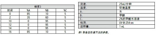 制備型HPLC分析使用一臺由沃特世2545型四元梯度模塊、2489型紫外/可見光檢測器、制備型色譜架以及基于SunFire Prep C18 OBD柱(5 μm、19 x 100 mm)的餾份收集器III組成的系統。整臺系統使用同時配備FractionLynx和開放操作型應用管理程序的MassLynx軟件進行控制。表1概述了方法參數、流動相組分和梯度條件,如第3頁所示。
