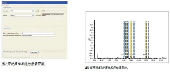 為進一步精簡HPLC純化過程,僅使用開放操作系統的登錄頁面即可簡化方法的選擇,如圖2所示。勾選登錄按鈕后,用戶可通過手動進樣器簡單實現進樣。檢測運行完成后,結果可被打印出來或電郵發送給用戶。這些梯度旨在確保即使用戶選擇了一種欠佳的方法,所有潛在的目標化合物也能從柱上被洗脫下來并得到收集。關于這一點的一個示例可參見圖3,該色譜圖顯示了使用梯度2分離出的肉桂提取物。兩種洗脫時間非常晚的化合物在薄層色譜目標化合物之后較長時間才得到收集。