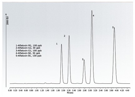 圖1. 采用FLR 檢測(cè)器和高通量流通池的ACQUITY UPLC H-CLASS系統(tǒng)進(jìn)行黃曲霉毒素分離