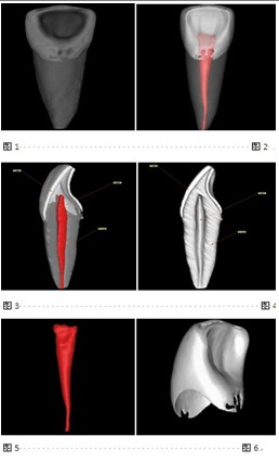 圖1 通過牙齒的三維圖,我們可以很清晰地看出牙齒表面結構,圖2中,通過設置參數,可以很明顯地觀測牙齒的內外整體構造。圖3和圖4,三維切面圖讓我們更直觀的觀察牙齒內部結構和牙根管的形態。圖5通過軟件自動精準的圖像分割技術,填充分離出牙根管,得到牙根管三維立體模型結構。為后期根管研究提供了模型化的基礎。圖6,通過牙釉質與牙本質密度差異的原理,分離出牙釉質,得到模型結構。這結構為以后的人工牙齒模型設計提供依據。