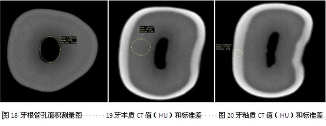 圖10為牙釉質厚度測量,圖10為牙本質厚度測量,圖12為牙根管長度測量。這些測量參數對研究牙齒形態結構的基本參數,是后期研究牙齒的基礎。 圖13至圖15分別為牙齒寬度,厚度和長度測量。圖16和圖17為牙冠空間三維測量