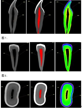 圖7至圖9分別是牙齒二維矢狀切面,冠狀切面和橫切面。其中每一個切面有分為原始灰度值切面圖,閾值分割彩色切面圖和偽彩色切面圖。由切面圖,我們很清晰的分辨出牙釉質,牙本質和牙根管的區域。
