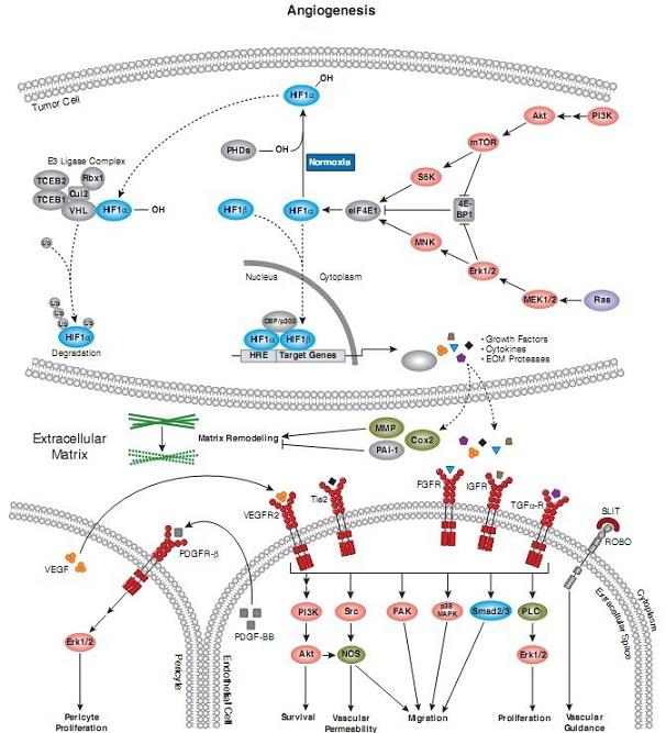 HIF1α,PHDs,HIF1β,PI3K,Akt,mTOR,S6K,4E-BP1,eIF4E1,elF4E1,Ras,MEK1,MEK2,Erk1,Erk2,MNK,CBP,P300,TCEB1,TCEB2,Rbx1,Cul2,VHL,MMP,Cox2,PAI-1,VEGF,PDGFR-β,VEGFR2,Tie2,FGFR,IGFR,TGFα-R,SLIT,ROBO,Src,FAK,p38,MAPK,Smad2,Smad3,PLCγ,NOS等。