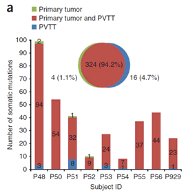 研究人員首先收集了10例HBV陽性肝癌患者的癌旁、癌和肝內轉移的門靜脈癌栓共29個組織樣本。利用上海伯豪生物技術有限公司的IlluminaGAIIx和ABI的SOLiD高通量測序平臺,進行全外顯子組測序分析。比較分析原位癌和轉移灶的測序結果,發現腫瘤細胞存在347個突變基因,平均每個腫瘤樣本有30-40個基因突變,其中大多數基因突變是第一次在肝癌樣本中發現,并且在原發灶和轉移灶中同時出現。說明肝癌的發病和轉移與基因突變密切相關,并且轉移相關基因在原發癌中就已經發生了突變。具體分析基因突變的類型,發現有5位患者存在明顯的C:G>A:T突變,有4位患者存在明顯的T:A>A:T突變。