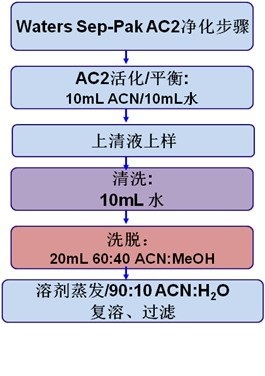 取1g奶粉加10mL 1%三氯乙酸溶解并沉淀蛋白,12,000轉高速離心10min;取2mL上清液上樣到Sep-Pak AC2小柱上(Sep-pak AC2上接30mL儲液器,wat011390),方法回收率91%。
