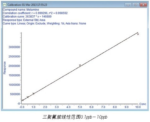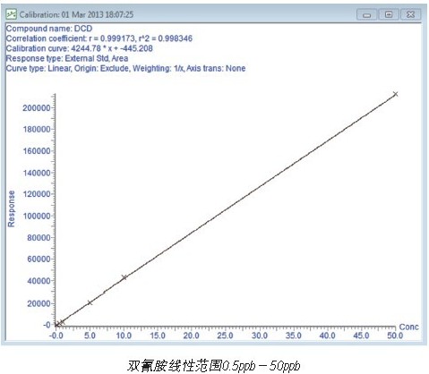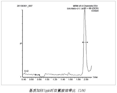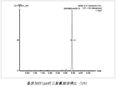 本實驗在未添加同位素內標的情況下,空白基質添加1ppb樣品濃度,測得雙氰胺平均回收率為83%,三聚氰胺平均回收率為71%。