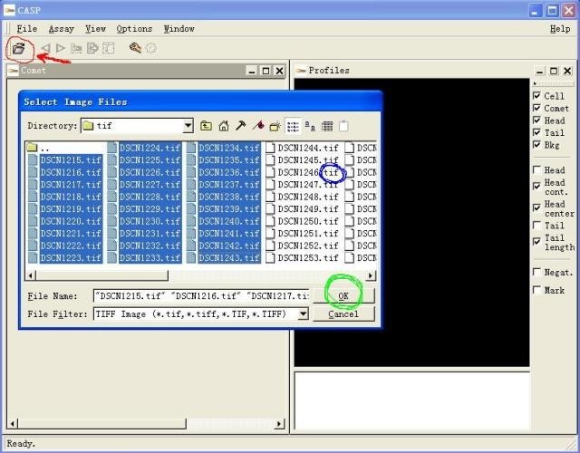 二、 單擊紅色箭頭所指按鈕,即打開文件,注意圖像文件應是TIF格式,(藍色圈定所指),按住SHIFT鍵,可以同時選定多個文件,點擊OK,(綠色圈定),CASP軟件就讀入了您所選的圖像文件。