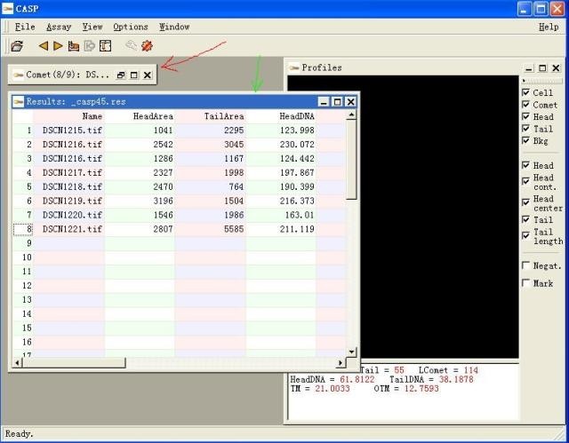 五、分析過程中或分析完成后,都可以看您的 result窗口,如圖,將圖像分析窗口最小化(紅色箭頭),就顯示出結果窗口(綠色箭頭),從左到右依次是文件名(name)和分析的各個指標。