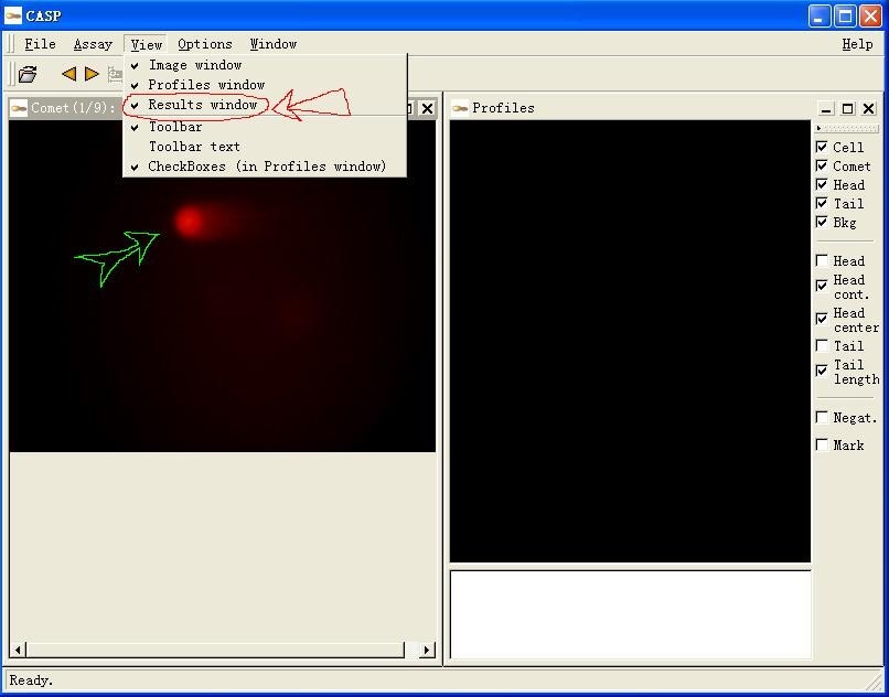 三、點擊view下拉菜單,選紅色箭頭所指的”result window",在分析后您就可以看到您的結果窗口,綠色箭頭所指是我做的彗星圖像。
