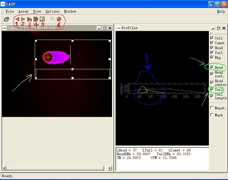 四、下面就可以開始分析了,分析之前最好把右側的head 和tail選中,(綠色箭頭所指,這樣可以出現頭、尾分明的視覺效果,如圖),在圖像分析框內按住左鍵下拉,出現黃色箭頭所指的框,這個框一定要圈住整個要分析的一個彗星圖像,然后就是用到紅色圈定區域的 按鈕了,我分別做了標號,逐一解釋:1和2:可以選前或后面的圖像進行分析,即上一個和下一個的功能,分析完第一個,當然要選下一個分析,很簡單!!!