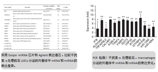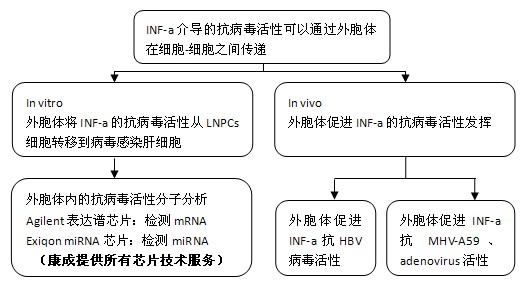 通過Agilent表達譜芯片和Exiqon miRNA芯片等實驗,發(fā)現(xiàn)干擾素-a處理的LNPCs分泌的外胞體富含抗病毒的mRNA和miRNA。LNPCs來源的外胞體被肝細胞內(nèi)吞,實現(xiàn)抗病毒分子在細胞間的傳遞;進一步實驗發(fā)現(xiàn),在小鼠活體實驗中,外胞體參與了干擾素-a抗鼠肝炎病毒A59和腺病毒的抗病毒反應(yīng)。