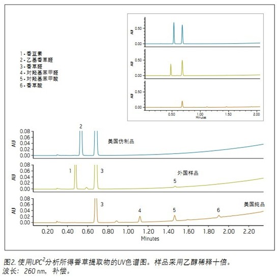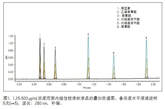 使用含有來自香草豆莢(香草醛,對(duì)羥基苯甲酸,對(duì)羥基苯甲醛和香草酸)的香味成分,以及合成香草醛(乙基香草醛)和禁用摻雜物香豆素的標(biāo)準(zhǔn)溶液進(jìn)行方法開發(fā)。標(biāo)準(zhǔn)溶液由異丙醇制備。實(shí)驗(yàn)采用ACQUITY UPC2™ BEH 2- EP 130Å 3.0 x 100 mm,1.7 μm色譜柱開發(fā)出一個(gè)2.5 min的方法,如圖1所示。UV方法條件中使用了20 mM檸檬酸的甲醇溶液作為改性劑/添加劑,用以改善酸性成分的峰形。