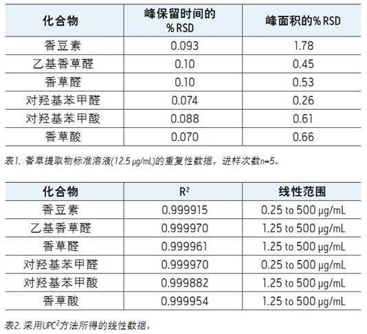 實(shí)驗(yàn)針對(duì)UV方法的重復(fù)性(表1)和線性(表2)進(jìn)行了評(píng)估。配制0.250-500 μg/mL的標(biāo)準(zhǔn)溶液。在12.5 g/mL濃度下,保留時(shí)間的重復(fù)性(n=5)≤0.10 %RSD,相同標(biāo)準(zhǔn)溶液進(jìn)樣的峰面積重復(fù)性為< 1.80 %RSD。線性范圍涵蓋兩至三個(gè)數(shù)量級(jí),與分析物相關(guān),R2 > 0.999(表2)。被測(cè)分析物的定量限(LOQ)的范圍在0.250至1.25 μg/mL之間。如果在分析香草提取物時(shí)需要稀釋樣品,使用UV法可滿足此特定分析的靈敏度要求。