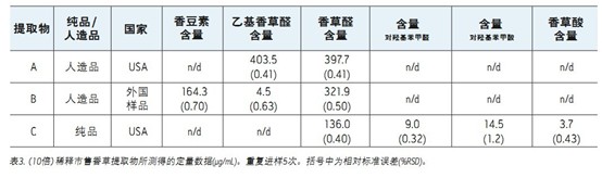 為檢測(cè)摻雜物,將此方法用于篩選來自不同地理區(qū)域的香草提取物(包括標(biāo)記為“純品”和“仿制品”的樣品)(圖3)。使用乙醇對(duì)香草提取物進(jìn)行十倍稀釋(樣品混溶),并在分析前過濾。來自美國(guó)的香草提取物仿制品(A)的分析結(jié)果顯示:同時(shí)存在有合成香草醛(乙基香草醛)和香草醛。由于此樣品中不存在其他的天然香料成分,說明香草醛極有可能是合成的。在美國(guó)之外購(gòu)得的已知香草提取物的偽造品(B)含有摻雜的香豆素以及香草醛,由于不含次生香草成分,因此也很可能來源于合成。最后,標(biāo)記為“純品”的香草提取物(C)的分析結(jié)果確認(rèn)其為真品。此樣品中同時(shí)鑒定出了香草醛和次生天然香料成分,并進(jìn)行了定量分析。此外,香草醛和對(duì)羥基苯甲醛的比值為14.9,位于純正香草提取物之前的指示范圍內(nèi)(表3)2。