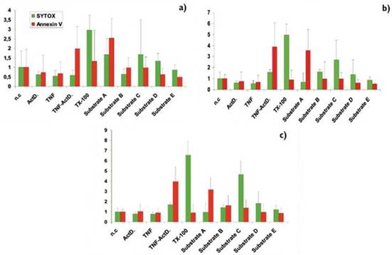 圖二. 1:HepG2細胞提前24小時種在平底的384孔板中,這些孔中的一部分細胞未經任何處理,而另一部分細胞試驗前18小時分別用TNF(25ng/ml)、Actinomycin-D(1ug/ml)和Triton X-100(0.1%)孵育,然后去除微孔板中培養基,將兩種標記物分子溶解在緩沖液中,37度孵育20分鐘。染色后,分別使用SpectraMax Paradigm 多功能檢測平臺的single-point(a)、on-the-fly(b)和area-scan(c)模式檢測結果,每個柱高度代表著平均熒光強度值(RFU)和5個重復孔的標準偏差。可以看出掃描孔內面積越大,得出結果就會更加的精確,尤其適合像腫瘤細胞這種單層不均一類型細胞的檢測試驗。