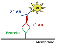 ScanLater Western Blot檢測系統簡化了Western Blot的流程,二抗使用銪元素-螯合物標記物,掃描在酶標儀上進行。不需要底物,膜洗滌后直接進行掃描檢測。銪元素具有長熒光壽命周期,至1ms,檢測模式使用時間分辨模式(TRF),可以極大減弱自發熒光和其余短壽命背景雜光。