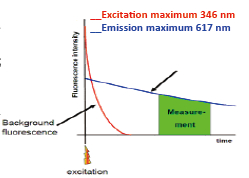 Figure 1. 上左:蛋白檢測示意圖。二抗直接使用銪元素標記。上右:銪元素-螯合物激發和發射光譜。下右:TRF檢測模式,銪元素的熒光周期與背景熒光的衰減周期對比,信號的檢測采取一定時間延遲,從而去除背景熒光干擾。