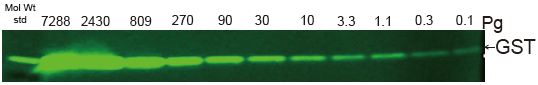 使用GST進行靈敏度和動態檢測范圍測試,使用1X上樣液三倍梯度稀釋GST,然后加到4-20%梯度膠中跑膠30min,然后轉印到Immobilon FL膜上,使用生物素標記的兔抗-GST標記2小時,之后與Eu-標記的鏈霉素孵育1小時,然后洗膜,晾干使用SpectraMax Paradigm多功能酶標儀進行掃描。系統表現出亞-皮克級的檢測靈敏度和>4logs的動態檢測范圍。