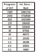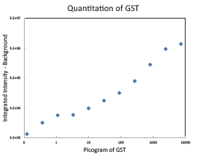 Figure 2. 上圖: SpectraMax Paradigm掃描的GST梯度稀釋標品圖像(注:偽彩標尺用來顯示大的動態檢測范圍);下圖:為每個條帶的總體熒光強度,統計顯示整個動態檢測范圍為4logs,線性檢測范圍為3logs,圖像分析使用Image J。