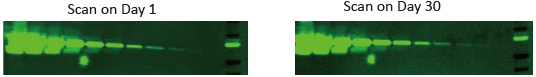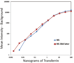 銪元素-標記的一個最突出的優點之一是信號的穩定性以及對光漂白的抗性,以致western膜印記條帶的穩定性可達數月之久。為了顯示這一點,我們將三倍梯度稀釋的轉鐵蛋白進行跑膠(4-20%梯度膠)30min,然后轉印Immobilon FL膜上,4℃與兔抗-轉鐵蛋白過夜孵育,然后與銪元素-標記的抗兔IgG 4℃孵育1小時,然后洗膜,晾干,使用SpectraMax Paradigm分別于當天和一個月之后進行掃描。