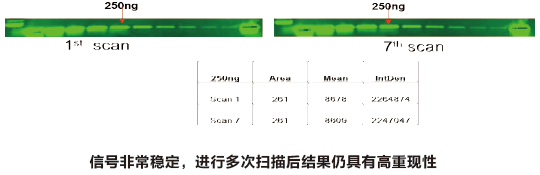 此外,條帶可以進行多次重復掃描,信號也不會降低,將2倍梯度稀釋的轉鐵蛋白跑膠(4-20%梯度膠)30min,然后轉印Immobilon FL膜上,與兔抗-轉鐵蛋白孵育2小時,然后與銪元素-標記的抗兔IgG 4℃孵育1小時,然后洗膜,晾干,使用SpectraMax Paradigm進行多次掃描。