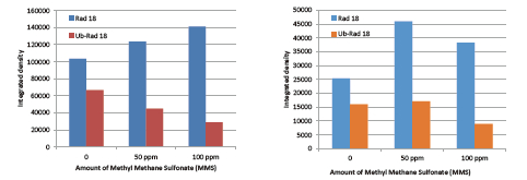Figure 5. 使用不同濃度(0, 50, 100 ppm)的致癌物MMS(一種烷化劑)處理HEK293細胞,然后分別使用Scanlater TRF法和化學發光法進行檢測和結果對比(Stanford University)。