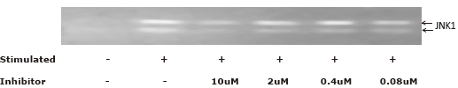 Figure 7. 檢測刺激和抑制后的自然人類肺成纖維細胞(NHFL)中的磷酸化的JNK1蛋白 (結果來自試用客戶)。