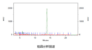 經分析,粗品純度約73%。由于樣品屬于萜類化合物,處于紫外吸收的末端,正相溶劑制備一般需要通用型檢測器,所以本制備方法是采用反相溶劑制備,205nm 和215nm 進行進行檢測。