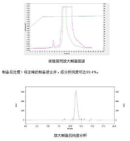 制備后分析:將制備主峰收集合并,按照上述標準方法對樣品進行分析,純度可達99.5%,室溫放置一晚,然后分析,純度有所下降,后雜增加,純度降低為98.9%。