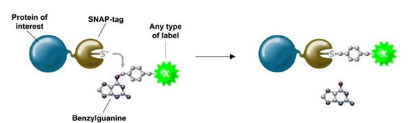 圖1. SNAP-tag標記示意圖。該標記方法具有特異性高、速度快、穩定性高及熒光探針選擇靈活多樣等優點