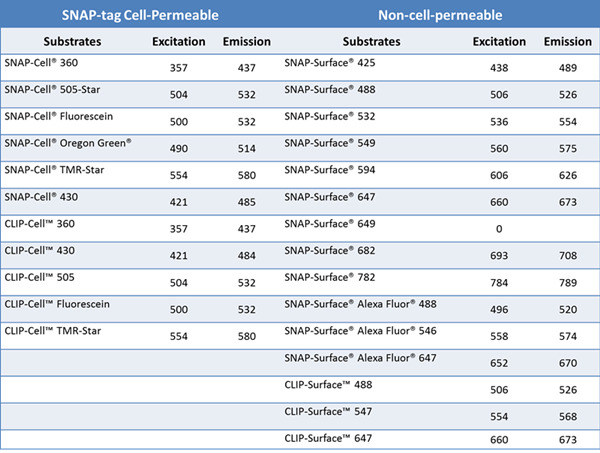 表1.目前NEB公司提供的多種多樣的SNAP-tag和CLIP-tag底物