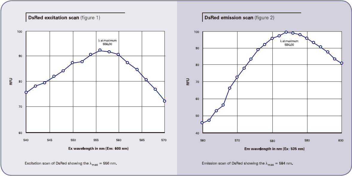 Molecular Devices公司的熒光讀板儀可以檢測完整貼壁細胞中的熒光蛋白。波長掃描可調的功能可以優化每一種獨特熒光染料的波長結果。底讀模式提供最佳檢測靈敏度,頂讀模式也可以提供可利用的數據,尤其是對含有ZsGreen和DsRed的細胞系。頂讀模式檢測DsRed細胞系時,可以通過替換無色培養基來達到優化實驗結果的目的。