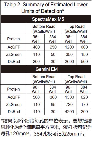 在本次實驗中,ZsGreen和DsRed細胞系在底讀模式都有著相似的檢測限,而且兩者都比AcGFP細胞系的檢測下限低3到4倍。本次實驗一共重復了三次,但是DsRed實驗結果并不是每次都能表現的足夠好。在一次實驗中,它的檢測下限近似于AcGFP,但是在另一次實驗中,它的檢測下限又會很高。我們將這些區別歸結于不同細胞系的通道數目不同。(伴隨著一個成功的通道,細胞就會變得越暗)DsRed細胞系在實驗開始階段比其它細胞系長得快,所以在第一次實驗中,它比其它細胞系多2-4倍的通道,結果就顯然不夠理想。